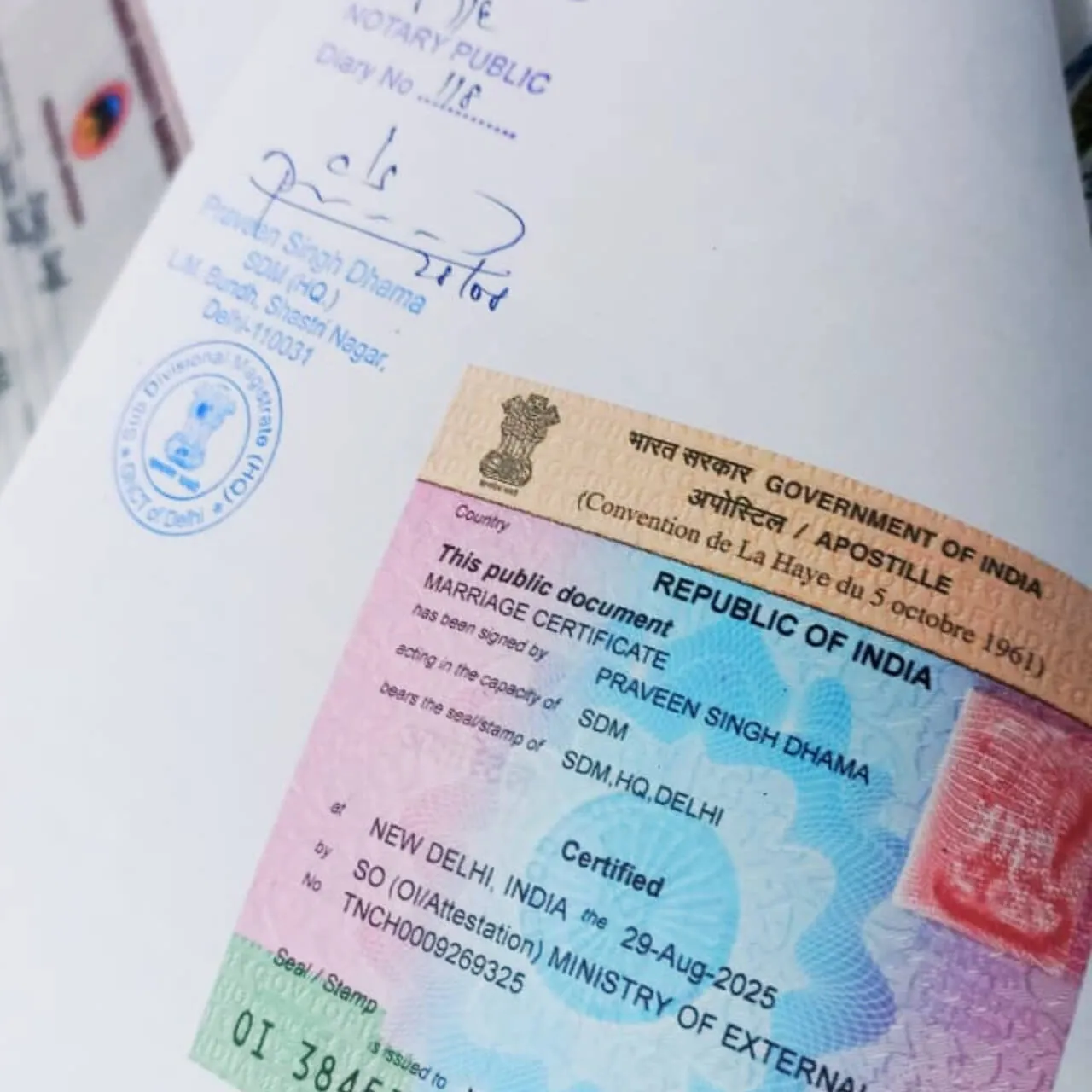 MEA Apostille for Indian marriage certificates. Choose Sticker or e-Apostille (QR). Clear pricing, required documents, 2–3 day SDM timelines, and worldwide delivery for NRIs.